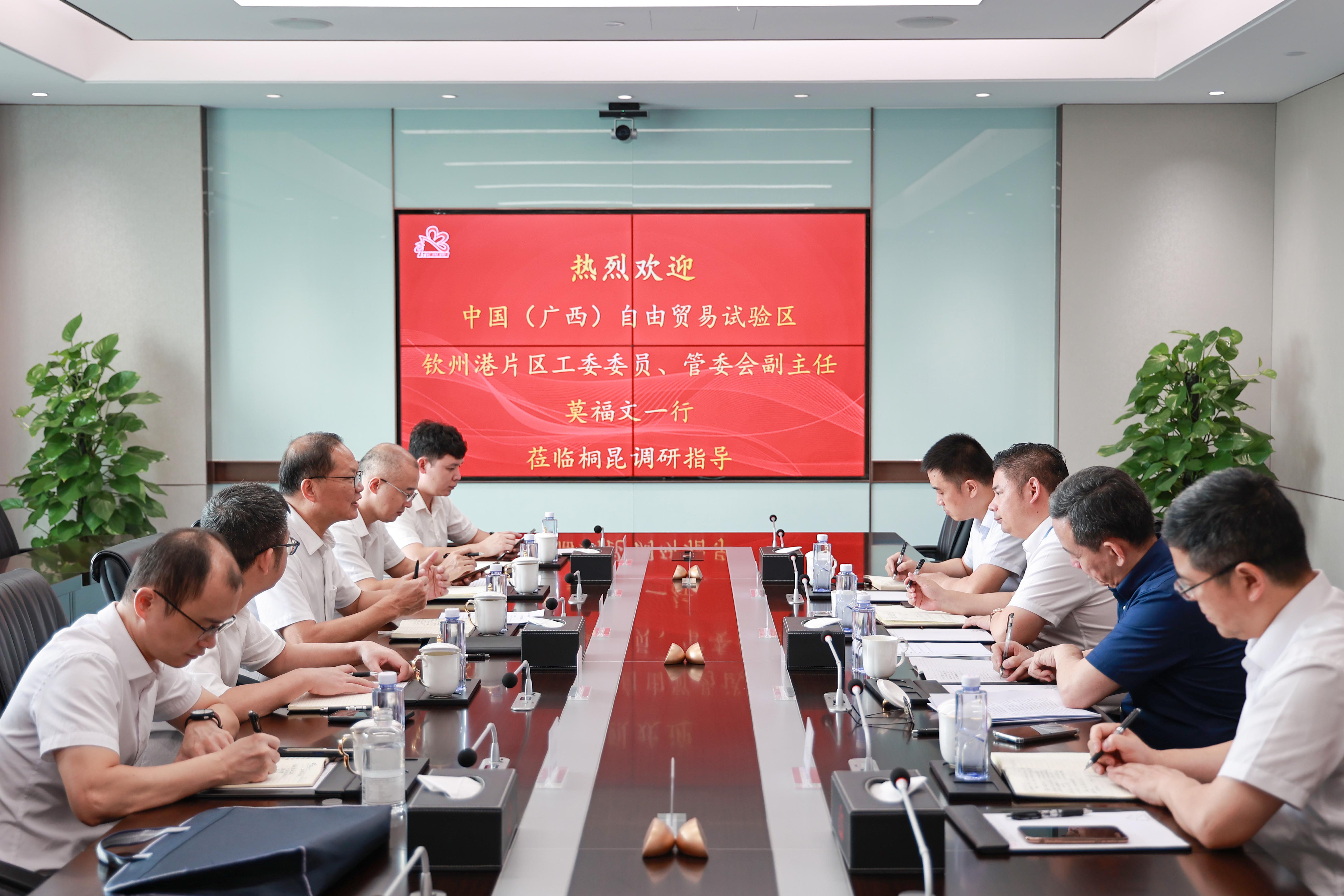8月31日上午,中國(廣西)自由貿(mào)易試驗(yàn)區(qū)欽州港片區(qū)管理委員會(huì)副主任、黨工委委員莫福文一行蒞臨桐昆調(diào)研,集團(tuán)公司執(zhí)行總裁李圣軍熱情接待并陪同座談。