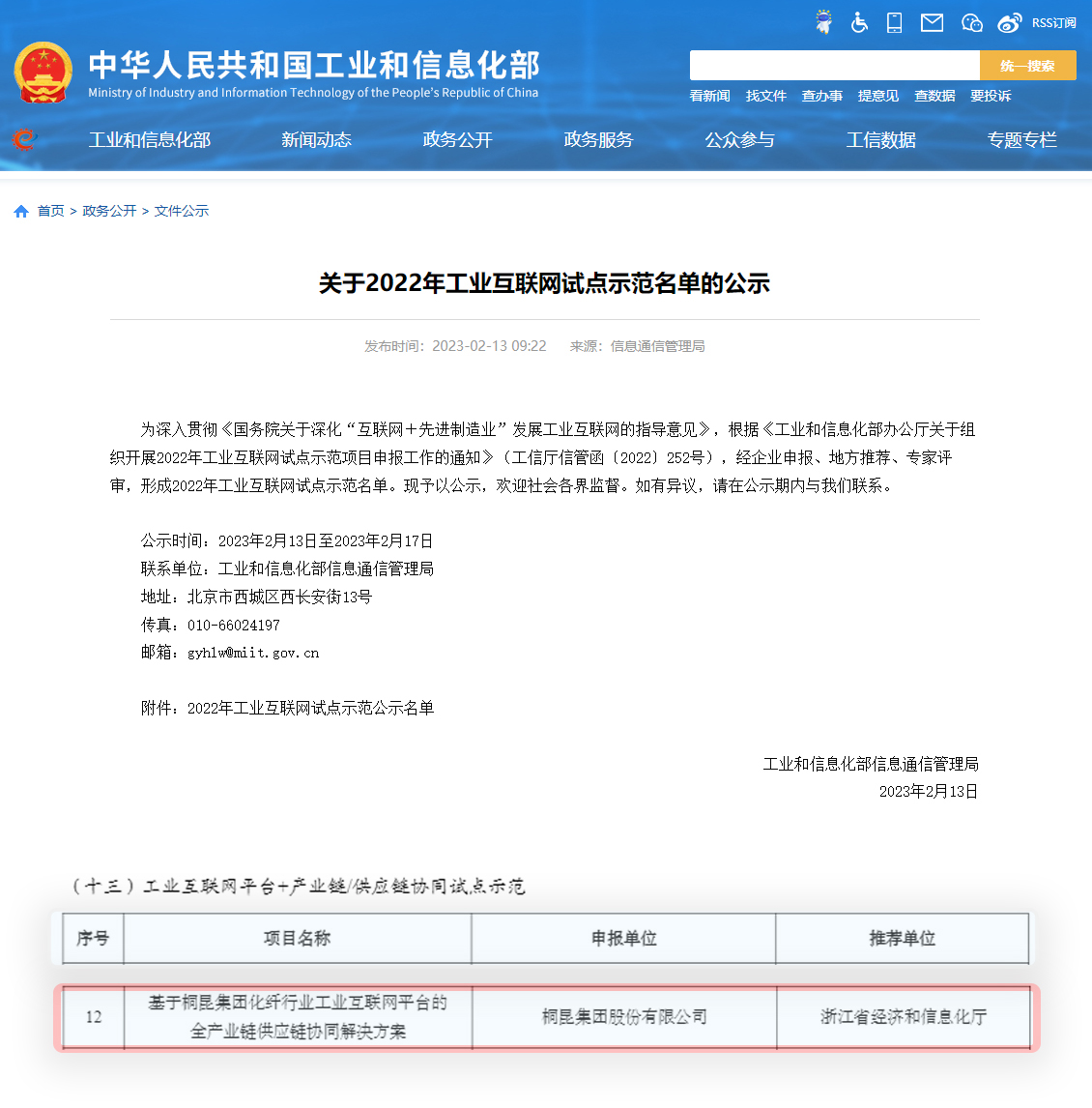 近日,國家工信部信息通信管理局發布了2022年工業互聯網試點示范公示名單。桐昆集團股份有限公司“基于桐昆集團化纖行業工業互聯網平臺的全產業鏈供應鏈協同解決方案”入圍工業互聯網平臺+產業鏈/供應鏈協同試點示范方向。